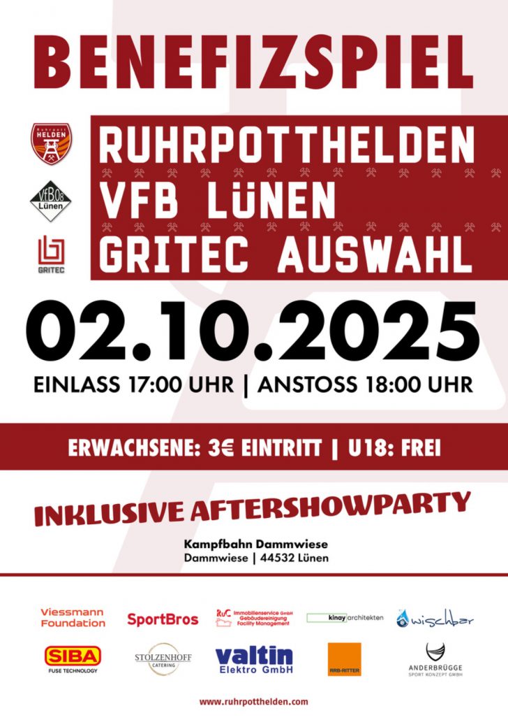 Datum / Uhrzeit:  12.07.2025 – 14:00 Uhr Ort: Am Freibad 2, 51570 Windeck Unter dem Motto „Fußball mit Herz“ laden die RuhrpottHelden herzlich dazu ein, gemeinsam einen unvergesslichen Fußballnachmittag zu erleben. Freut euch auf eine tolle Atmosphäre, leckere...